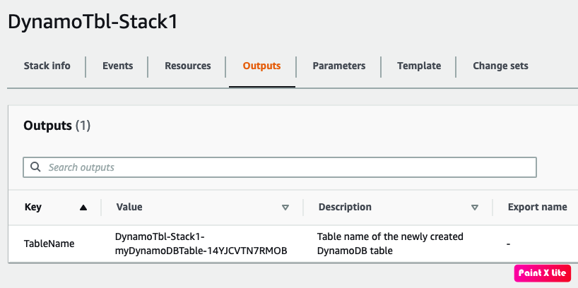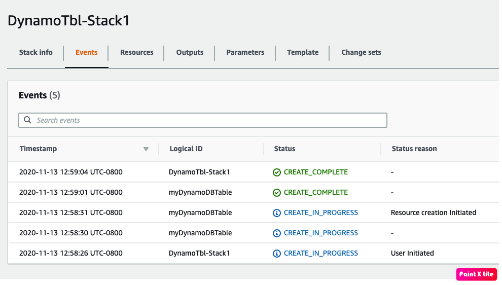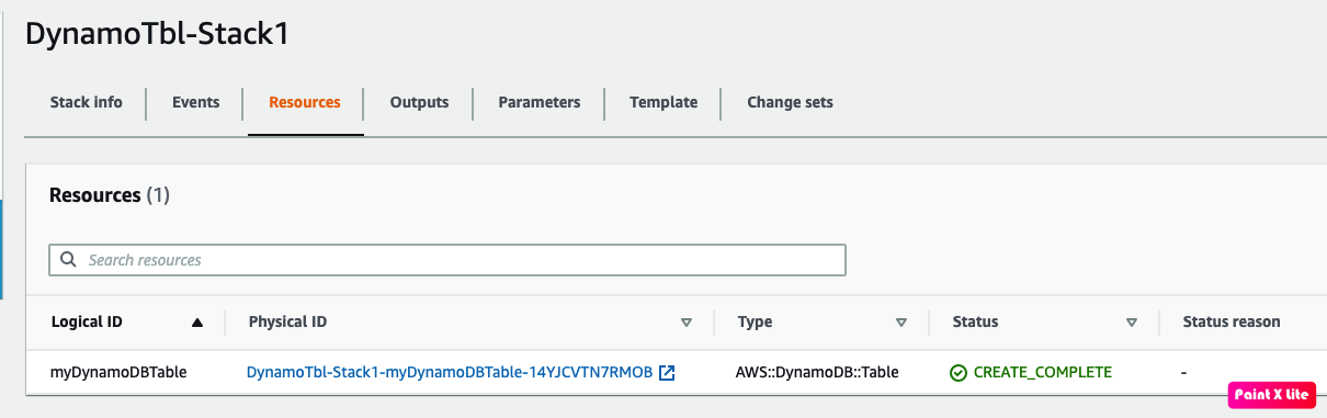 As seen CloudFormation created the stack with the resource 'myDynamoDbTable'